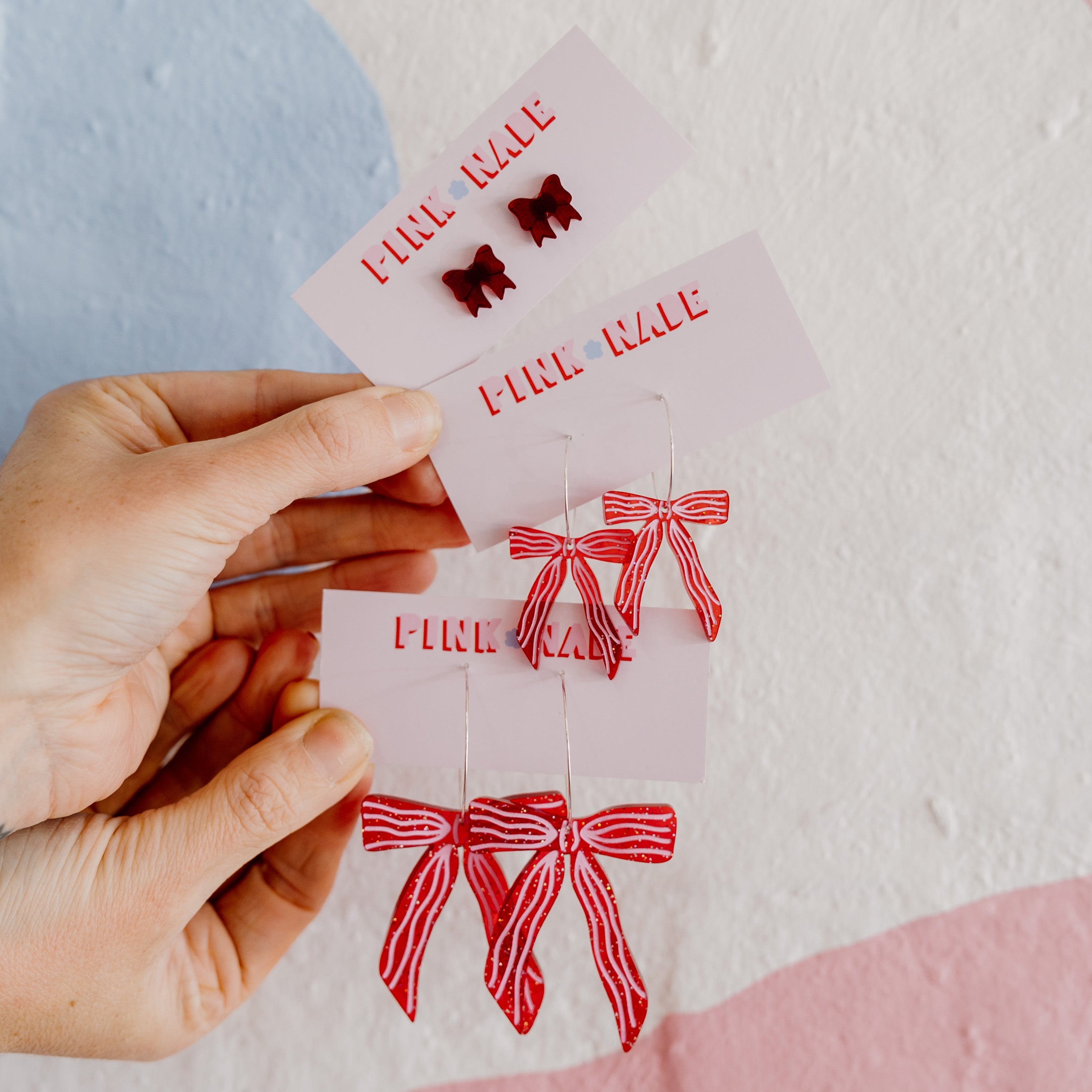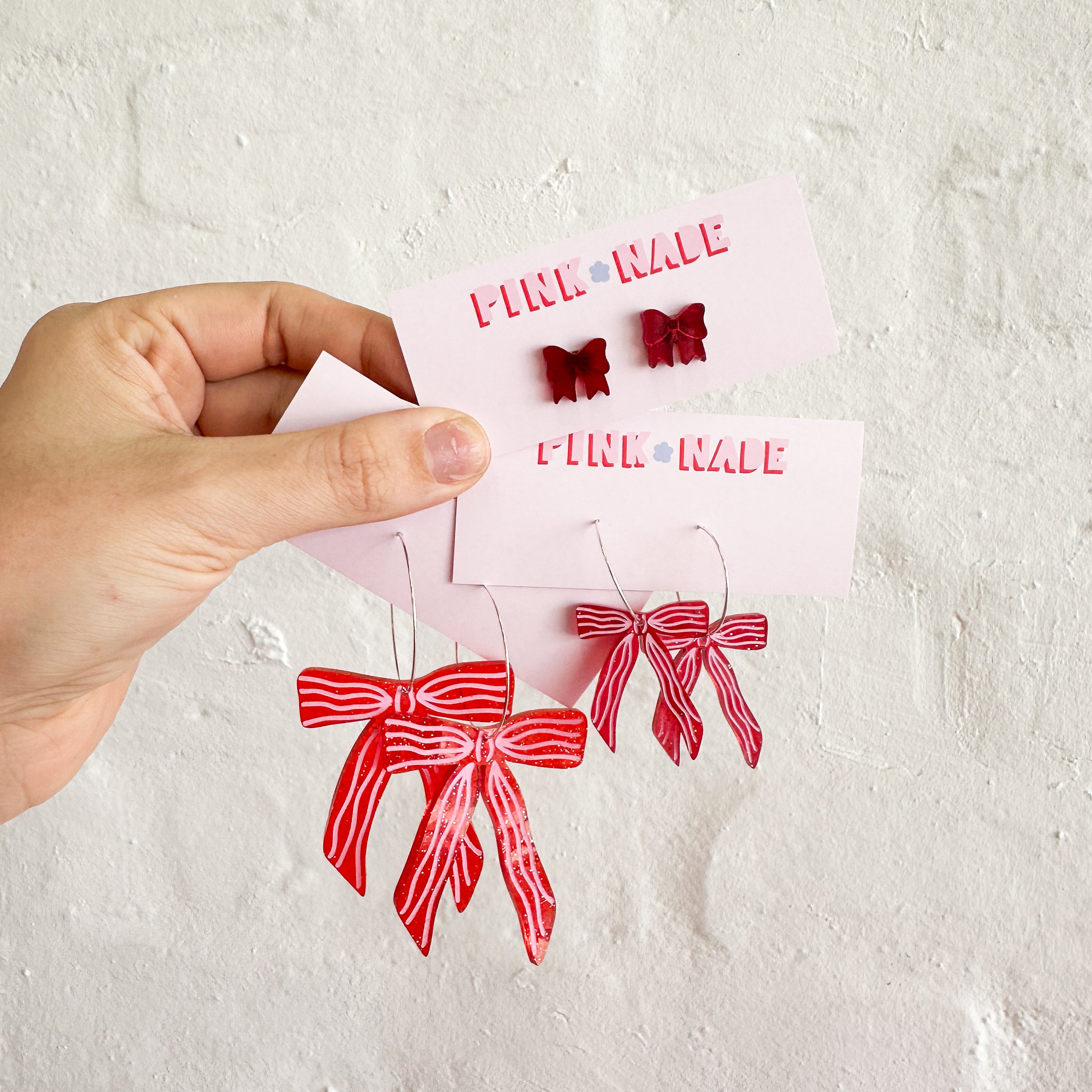 ✨ Statement Bow Hoops, handcrafted from translucent red glitter acrylic with hand-painted pink stripes. Each bow is carefully heated and sculpted by hand to create beautiful, natural movement and texture!