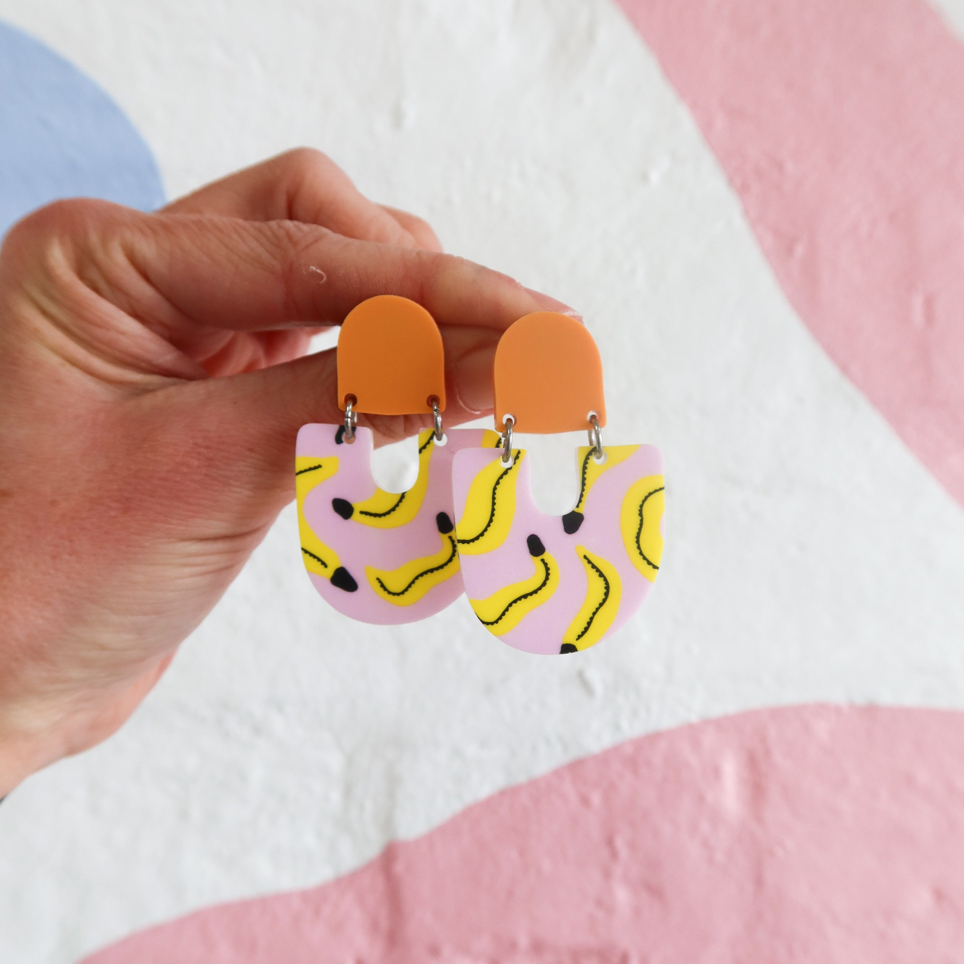 Introducing our new Banana Collection created from my original Banana artwork that won the Gorman scrubs competition, of light weight, hypoallergenic acrylic statement dangles!