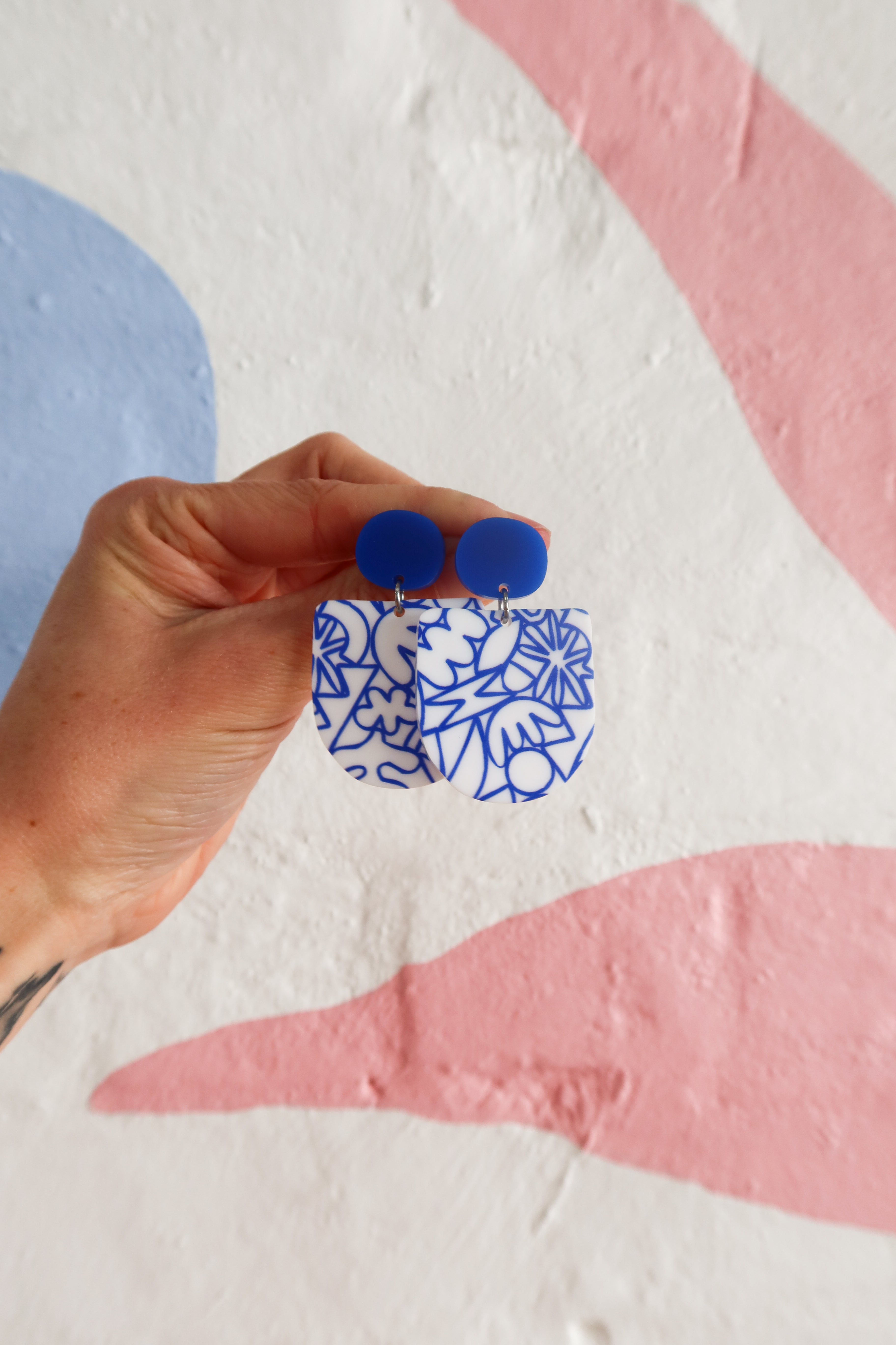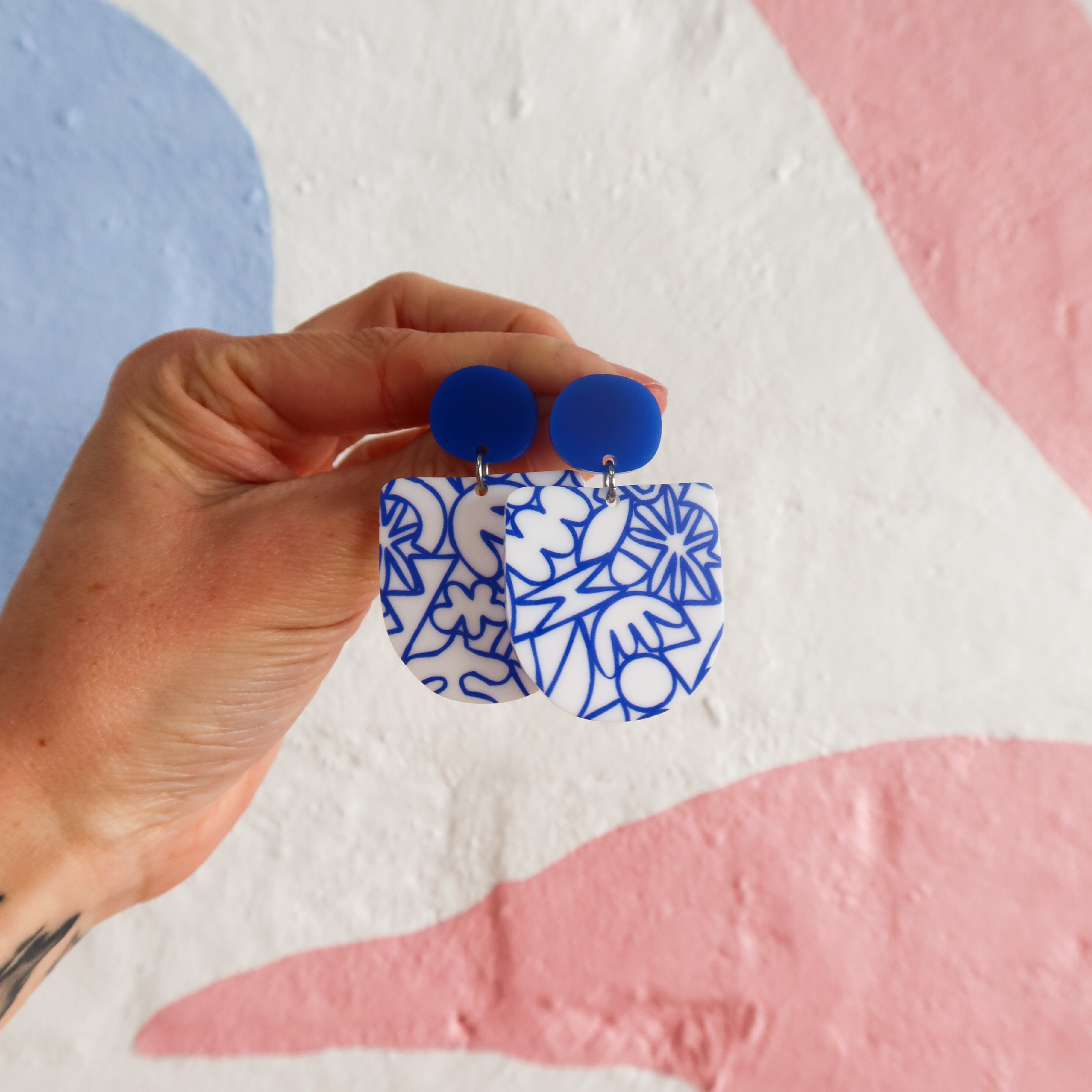 Materials: 3mm Printed Acrylic, 8mm Flat Pad 304 Surgical Stainless Steel Posts.