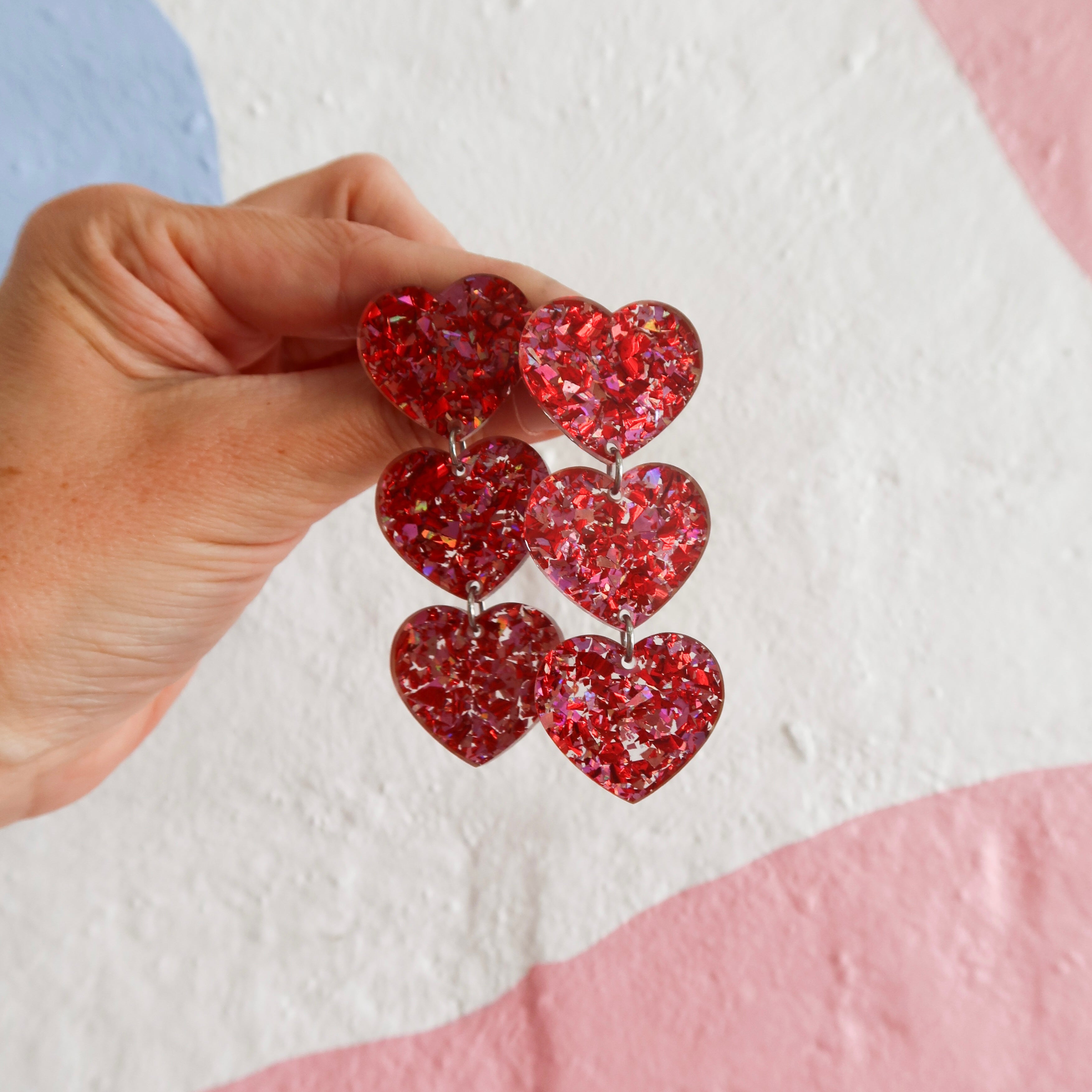 Valentine's Heart Red Pink Glitter Dangle Earrings