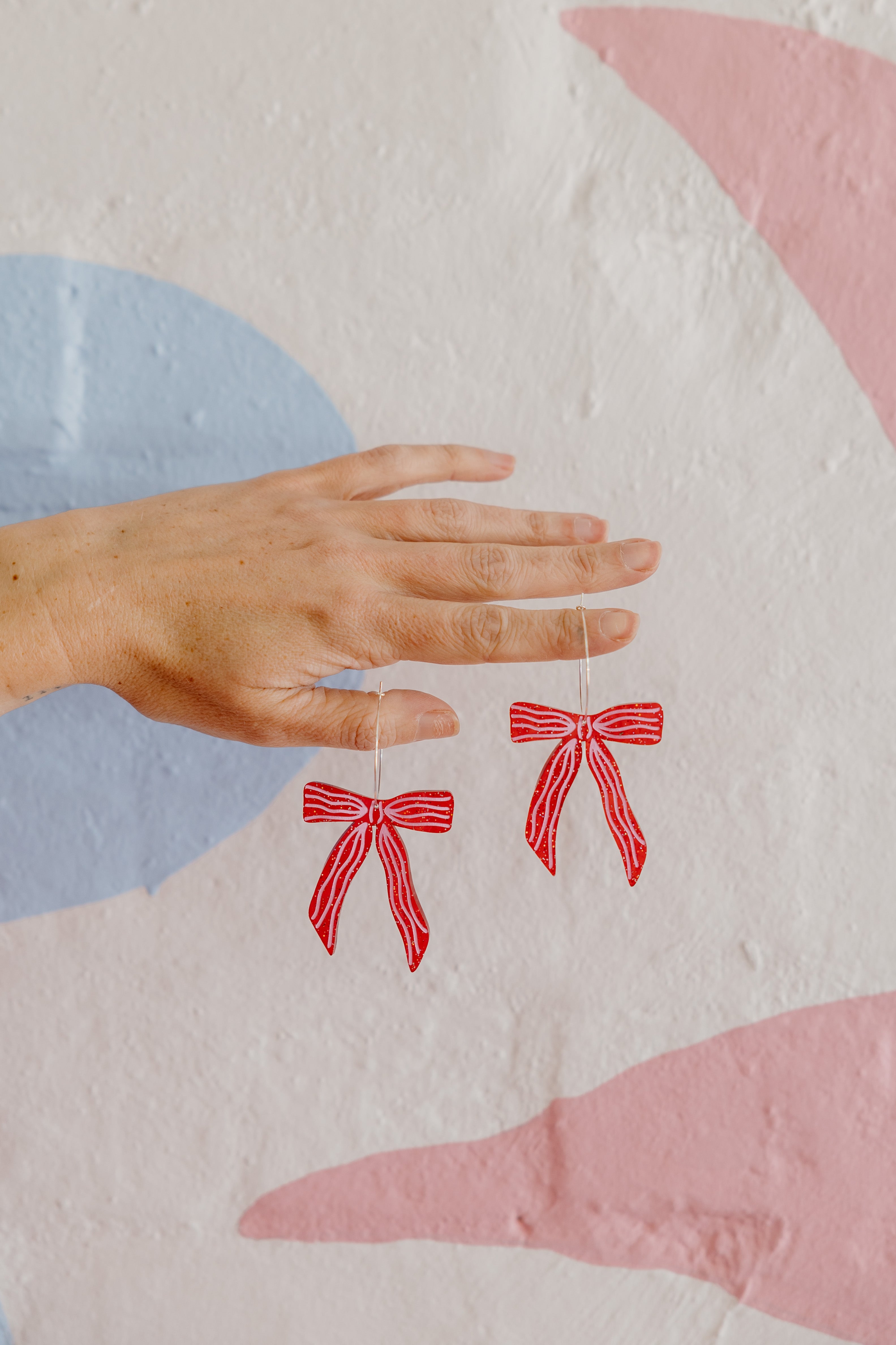 Crafted from a super special translucent red glitter acrylic, each bow is etched and hand-painted in soft, dreamy pink detailing. The bow artwork itself? A hand-drawn design because your lobes deserve something original, not copy/paste.